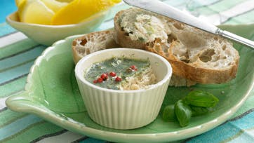 Fordel blandingen i 6 ramakiner (små ovnfaste skåle) og rør dilden i resten af smørret. Hæld dildsmørret over krabbeblandingen sammen med lidt hele rosenpeberkorn og stil dem på køl i mindst 1 time.