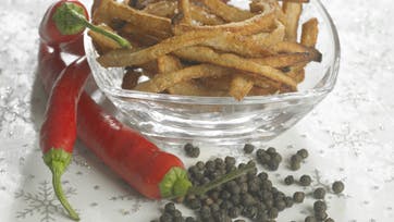 Skær sværen i strimler og kog vandet op med salt, peberkorn og chili. Kog sværene i vandet i 15 min. Hæld vand og krydderier fra og dup sværene tørre med køkkenrulle. Varm olien godt op på en pande og tilsæt sværene. Steg sværene, til de er gyldne og sprøde, vend dem et par gange undervejs. Lad sværene dryppe af på et stykke køkkenrulle og drys med groft salt.