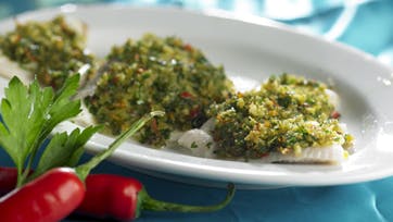 Tynde fileter foldes over inden paneringen. Stegetiden på øverste rille i ovnen i et smurt ildfast fad er 10-15 min. ved 200° afhængig af fiskens tykkelse.