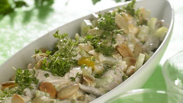 Bland kyllingekød, halvdelen af mandlerne, bladselleri og godt halvdelen af karsen i en skål. Hæld saucen over og pynt med resten af mandlerne og brøndkarsen.