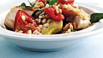 Lad kyllingefileterne køle lidt af og skær dem i skiver. Vend perlespelten forsigtigt med 2 spsk. olie, vineddike, kylling, peberfrugter, tomater, artiskokhjerter i kvarte og grofthakket oregano.