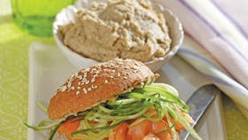 Hæld væden fra bønnerne og skyl dem under koldt vand. Blend bønner, hvidløg, dild, peanuts og limesaft med olien til en cremet masse. Rør garam masala og chili i og smag til med salt og peber. Flæk bollerne og skær agurken i tynde strimler. Smør bollerne med bønnecremen og læg dem sammen med laks og agurkestrimler.