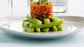 Hak laksen fint og rør den med finthakket dild, saft af 1 limefrugt og 1 spsk. olie. Smag til med salt og peber. Skræl agurkerne, halver dem og fjern kernerne med en teske. Skær agurkerne i lange, tykke bjælker.