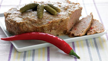 Hak bacon og løg i kødhakker eller i blender og bland det med lammekødet. Tilsæt hvidløg, chili, finthakket rosmarin, salt og peber sammen med ægget. Bland fløde og mel i farsen skiftevis og rør godt igennem. Kom farsen i en smurt postejform og bank den et par gange mod bordpladen, så farsen pakkes godt i formen. Stil postejen i en bradepande med vand, så den nederste halvdel af formen er dækket, og stil bradepanden i ovnen. Bag postejen ved 150° i 60 min. og server den lun med brød og cornichoner.
