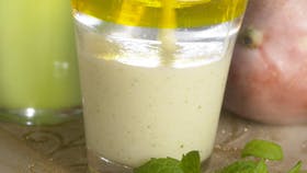 Fjern mangostenen, skær skrællen af og kødet i terninger. Blend mangoternene med yoghurt, vand, mynteblade og sukker. Tilsæt isterninger, hvis drikken skal serveres straks eller stil den på køl.