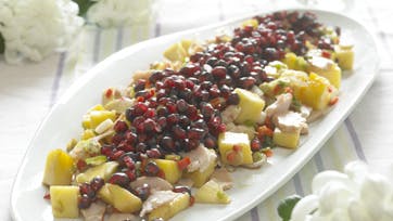 Skræl mangoen og skær kødet i tern. Befri chilien for kerner, hak den fint og skær forårsløgene i skiver. Pil kyllingekødet i mindre stykker og bland dem med mango, chili, forårsløg og ingefær. Pisk limesaft og soja sammen og hæld det over salaten. Halver granatæblet, skrab kernerne ud, kom dem over salaten og server med et godt stykke brød.