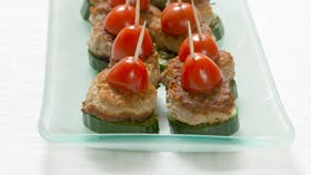Servering: Skær agurk i skiver og giv dem en klat pesto. Stik dem på tynde træspid sammen med frikadeller og halve tomater.