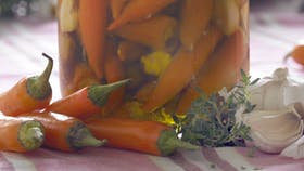 Skær toppen af chilifrugterne og fjern kernerne. Bland eddike, vand, saften fra citronerne og salt og bring det i kog. Kom chilierne i den kogende lage og kog dem i 1 min. Stands kogningen ved at komme chilierne direkte i en skål med iskoldt vand og lad dem dryppe godt af i en sigte. Skær fetaosten i aflange, trekantede stykker og fyld dem i chilierne. Læg chilierne i et rengjort sylteglas sammen med pillede hvidløgsfed, timiankviste og peberkorn. Hæld olivenolien over, så chilierne er dækket, og lad dem trække i mindst 2 dage.