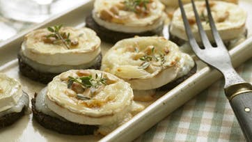 Rist pinjekerne gyldne på en tør pande. Smør gedeosten i et jævnt lag på pumpernicklen. Lav en fordybning med tommelfingeren i midten og fyld honning i. Drys pinjekernerne på og sæt dem i ovnen på plade med bagepapir 2-3 min. ved 250°. Pynt med timian.