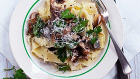 Kog pastaen efter anvisningen på emballagen. Lad den dryppe af i en sigte. Skyl persillen og hak den groft. Riv parmesanosten på et rivejern. Vend den friskkogte pasta sammen med hakket persille og svampesauce og anret på fire tallerkner. Server med et drys revet parmesan og gerne lidt godt brød til.
