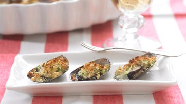 Gratiner muslingerne under ovnens grill i 5 min., til de er gyldne, og server.