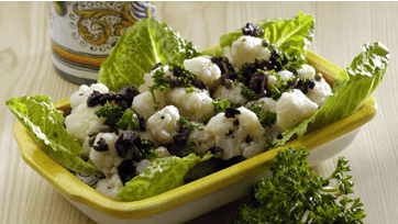 Kog blomkålsbuketterne godt og vel halvmøre, de må gerne knase lidt. Hæld dem i en sigte og skyl dem med koldt vand. Dressing: Pisk olivenolie, citronsaft, salt, peber, krydderurter og kapers sammen. Hak oliven groft og kom dem i. Bland de afdryppede blomkålsbuketter med dressing og lad det trække køligt en halv times tid.