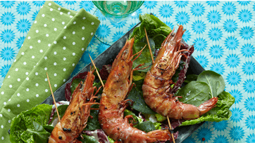 Sæt 4 rejer på hver spid. Rør olie, salt, knust rosa peber og citronsaft og skal sammen. Tænd for grillen eller en grillpande. Skyl og afdryp salaterne. Vend dem med halvdelen af dressingen og smør resten på rejerne. Grill rejerne 2 min. på hver side. Dryp lidt pesto på toppen af rejerne og klip masser af purløg over salaten, der anrettes på fad med de grillede spid øverst.