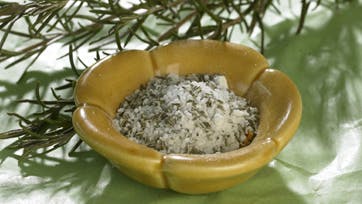 Blend efter smag og rosmarinens styrke 1 dl groft salt med ca. ½ dl rosmarinnåle.