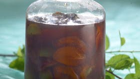 1 kg blommer4 dl mørk rom4 dl rørsukker1 tyk stang vanilje1 lime i tynde skiverSkyl blommerne, halver dem og fjern stenene. Bland rom og sukker i en