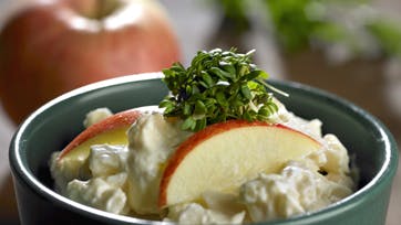 (4 pers.)175 g rygeost 1%¾ dl kaffefløde200 g jordskokker100 g æbleSalt og peberKarseRør rygeost og fløde glat. Skræl jordskokker og æble og skær dem