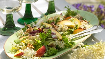 Anret salaten med frugt, hyldeskærm og nødder og drys med dressing af olie, citronsaft, salt, peber, nellike, honning og citronsaft.