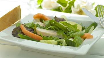 Kog ærterne 2 min. i letsaltet vand. Skræl melonen og skær den i tynde både. Skær kyllingen i skiver. Skær agurken i tykke skiver og halver dem. Fordel salat, løg fra kyllingekogningen, ærter, melon, agurk og kylling på salatblade. Pisk dressingen sammen og dryp den over.