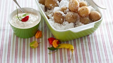 Vask kartoflerne og læg dem i et ovnfast fad. Kom saltet over, så de er helt dækket, og bag dem ved 200° i 40 min. Hak chilien fint og klip dilden. Rør cremefraiche, ketchup og sirup sammen, tilsæt chili og dild og lad den trække på køl i mindst 15 min. Server kartoflerne varme med den kolde sovs som snack eller som tilbehør til en god steg.