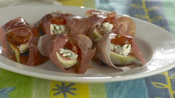 Skær tomaterne på langs og dryp med salt, peber og olie. Stil dem i ovnen ved 125° i 1 time. Skær så fignerne i halve og rør osten med purløg. Læg skinkeskiverne sammen to og to og læg en halv figen på hver dobbeltskive. Kom en skefuld ost på hver halve figen. Læg så en tomat øverst og rul skinken omkring. Dryp med honning og olie og server med nyristet brød og et glas kølig italiensk hvidvin.