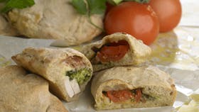 Skær osten i skiver og læg lidt på hver cirkels ene halvdel. Smør pesto på og skær soltørret tomat i strimler og tomat i skiver og læg i hvert brød, der lukkes sammen og klemmes fast med gaffel. Pensles med lidt vand og bages ved 220° i 15-20 min.
