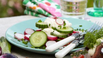 Pisk rygeost og cremefraiche sammen og smag til med salt, peber og en anelse sukker. Skær tomater og agurk i mellemtykke i skiver. Rens og snit radiserne. Læg grønsagerne på et lille fad eller tallerkenvis og top op med rygeosten. Pynt med masser af purløg. Spis rugbrød, gerne ristet, til.