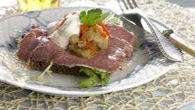 Smør rugbrødet og læg salatblade på. Læg skiver af oksebryst på. Pisk fløden til skum og smag til med peberrod. Læg flødepeberrod og pickles på og pynt med tomat og persille. Steg løgringe til de er sprøde. Lad dem dryppe af på fedtsugende papir. Pynt øverst på stykket.