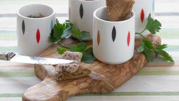 aften. Smag til med salt og peber. Kom i 4-8 små skåle og afkøl i mindst 2 timer. Skær pitabrødet i små kvarte og pensl med lidt olie. Stil i ovnen i 5-8 min ved 200°, til det er gyldent og sprødt, og server til den kolde mousse pyntet med forårsløg.