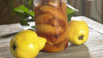 Vask kvæderne. Skær dem i kvarter med en god skarp kniv, de er meget hårde. Fjern kernerne og del kvarterne på langs, hvis de er store. Bring æbleeddike, æblemost, vand, sukker og sennep eller kardemomme i kog i sauterpande eller bredbundet gryde. Tilsæt kvæderne og kog dem sagte møre på ca. 3/4 time. Læg kvæderne i et skoldet glas. Kog evt. væden lidt ind, men ikke mere, end den kan dække kvæderne. Hæld den rødlige lage over kvæderne og luk glasset.