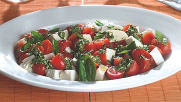 Skyl tomaterne og skær i halve eller i skiver. Skær mozzarellaen i skriver og bland dem med tomaterne. Bland pesto med salt, peber, eddike og olie og hæld det i striber over salaten, der pyntes med basilikumblade.