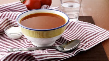 Skræl gulerødderne og skær dem og tomaterne i mindre stykker. Pil og hak løg og hvidløg og svits dem i smørret. Tilsæt gulerod, tomat, bouillon og salt og lad det koge under låg i 15 min. Rør yoghurt med peberrod, hvidvinseddike og sukker og smag til med salt og peber. Blend eller purer suppen gennem en sigte til den er helt glat og smag til med salt og peber. Server suppen med peberrodscreme og groft brød.