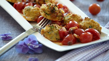 Udblød brødet uden skorpe i mælken. Pil bladene af persille og oregano og hak fint. Rør tun, brød, krydderurter, citronskal, ost og æg sammen og smag til med salt og peber. Form farsen til små frikadeller og steg dem i ovnen ved 200º i ca. 15 min.Skyl tomaterne og steg dem i olivenolie på pande. Inden væden trænger for meget ud, pilles og hakkes hvidløg, og det steger med.