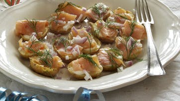 Udhulede kartofler med røget laks og peberrodscreme