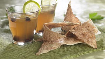 Tø dejen op. Bland sukker og kanel på et stykke bage- eller madpapir. Træk forsigtigt et stykke dej løst, spray med vand og læg det i sukkerblandingen. Tril kagerullen frem og tilbage 3- 4 gange uden at trykke for meget. Vend dejen og gentag rulningen. Skær dejen i 4 trekanter og læg dem på plade med bagepapir. Bages på midterrillen ved 150° i 12-14 min. Mens chipsene er helt varme, kan de foldes. De holder sig sprøde på bageristen til næste dag.