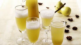 Skræl pærerne, fjern kernehuset og skær dem i mindre stykker. Riv skallen og pres saften af appelsin og lime og kom det i en gryde sammen med pærer, cider, anis, lakridsrod og sukker. Kog blandingen op og lad det småkoge under låg i 20 min. Fjern lakridsrod og stjerneanis, blend pærerne sammen med saften eller purer dem gennem en sigte og giv pæresaften et opkog. Fyld champagneglas halvt op med den varme saft, fyld op med champagne og server.