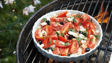 Skær tomaterne i kvarte, løget i tern og hvidløgsfeddene i skiver og bland dem med revet skal og saft fra citronen. Kom blandingen i et ildfast fad, drys med krydderurter, oliven og salt og hæld vinen ved. Stil fadet på grillen direkte over kullene i ca. 15 min., rør i tomaterne et par gange undervejs.