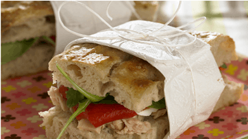 Flæk ciabattabrødene og dræn tunen for olie. Fordel tunen på bunden af de to ciabattabrød. Kog, afkøl og pil æggene og skær dem i skiver. Læg dem på tunen sammen med skiver af oliedrænet artiskok. Fjern frøstolen i peberfrugten og skær frugten i flade stykker. Fordel sammen med skyllet rucola og blade af basilikum over sandwichene. Rør lidt olie, citronsaft, salt og peber sammen og dryp det på toppen og luk med lågene. Skær dem i tykke stykker, der snøres sammen med en serviet og lidt bastbånd for at holde på dem.