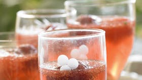 Skær vandmelon og kiwier i tern og skyl jordbærrene. Læg vandmelon, kiwi og jordbær i fryseren i mindst 2 timer. Blend vandmelonen med grenadine, bland med hvidvin og stil blandingen på køl. Tilsæt danskvand og frosne frugter og server straks.