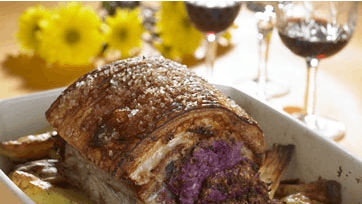 Rids sværen og skær en lomme vandret i kødets længde. Bland en fars af revne æbler, rødkål, rødløg, salt, peber, mælk og havregryn. Kom farsen i lommen på ribbensstegen og gnid sværen med groft salt. Skær pastinakker og kartofler i mindre stykker og bland dem med olie, persille, salt og peber. Læg kartofler og pastinakker i et ovnfast fad og placer ribbensstegen ovenover. Sæt fadet i ovnen ved 200° i 1 time og 15 min. Server med yoghurt rørt med mynte, salt og peber.