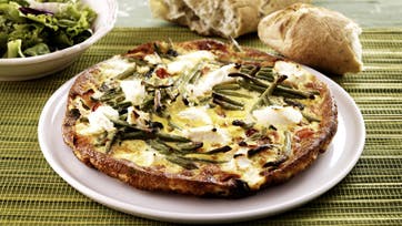 Kog bønnerne i saltet vand i 3 min. Dræn. Pisk æg, æggehvider, mælk og 2 spsk. ricotta sammen i en skål. Tilsæt bønner, halverede tomater, laks, basilikum, salt og peber. Smør en rund form på ca. 20 cm i diameter. Kom massen heri og læg skefulde af resterende ricotta over. Bages i ovnen ved 180° i 25 min. til den er gylden. Server med brød og grøn salat.