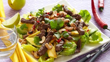 Skær kødet i strimler og svits det i olien et par min. Tilsæt oyster saucen, svits endnu et par min og tag det af varmen. Skyl salaten, del den i blade og læg dem på et fad. Skær avocadoerne over på midten, fjern kernen og skrællen og skær dem i skiver. Skræl mangoen og skær den i tynde stænger. Skyl radiser og forårsløg og skær dem i tynde skiver. Læg alle grønsager og frugter op på fadet og fordel kødet over. Rist nødderne på en tør pande, til de er let gyldne, og lad dem køle. Bland limesaft, chilisovs, soya og sesamolie sammen og hæld dressingen over salaten. Hak chilien fint og drys salaten med koriander, chili og nødder.