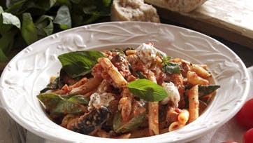 (2 pers.)200 g pennepasta1 spsk. olivenolie1 hakket løg1 aubergine i små tern1 ds. hakkede flåede tomater1 nip sukker1 håndfuld basilikum200 g gedeost