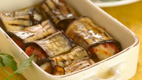 Skær auberginerne i lange, flade "såler". Drys med groft salt og stil på højkant i dørslag i vasken, så de kan trække vand ud, og blive lækre. Efter 20 min. børstes saltet af, og auberginerne tørres godt med køkkenrulle. Pensles med olivenolie og grilles i ovnen ca. 8 min., til de er lysebrune. Stykkerne vendes, og processen gentages. Endeskiverne hakkes og blandes med løg, hvidløg og olie og steges 5 min. Tilsæt tomater og kog ind, så det er som grød. Smages til med oliven, hakket basilikum og skiver af mozzarella. Auberginerne rulles om fyldet og lægges i et ovnfast fad, der hældes lidt olie over, og det sættes i ovnen ved 220 grader i 10 min. Serveres lune med lidt salat og flute til.