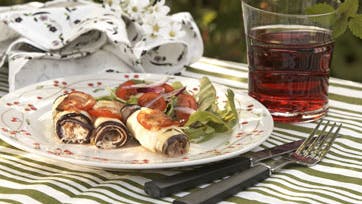 Skær auberginerne i tynde skiver på langs. Drys skiverne med salt og lad dem ligge 15 min. for at trække væsken ud. Rør kødet med æg, rasp og tomatpure. Hak snackpeber og hvidløg fint, og rør det i farsen sammen med krydderierne. Skyl aubergineskiverne og læg en skefuld fars på hver. Rul auberginerne sammen om farsen og læg dem i et ovnfast fad. Læg tomatskiver over rullerne og drys med osten. Bag rullerne i ovnen ved 200° i 15 min. og server med grøn salat.