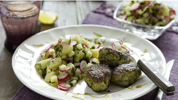 - Skær radiserne i tynde skiver og bland dem med agurk og kartofler.