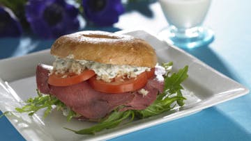 (2 pers.)10 min.2 bagels100 g roastbeef i tynde skiver1 håndfuld rucolasalat2 tomater1 spsk. høvlet peberrodTatarsauce: ½ dl mayonnaise1 spsk. fromage