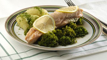 Flæk lakseskiverne og smør dem med et tykt lag ost. Læg dem sammen som sandwich med røget laks i midten og giv dem salt og peber. Læg laksen i et ildfast fad. Skær citronen i skiver og læg dem på laksen. Sæt fadet midt i ovnen ved 200° ca. 15 min., til laksen er mør. Skær den grove midterribbe af grønkålen og skyl bladene. Varm smør og vand med lidt salt i en sauterpande. Kom grønkålen i og kog den 2-3 min., til den skifter farve. Server laksen på grønkålsbladene og giv små kartofler til.