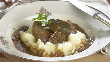 Skær kødet i 1 cm tykke skiver og bank dem let med håndroden. Kom melet i en plasticpose med salt og peber. Læg kødet i posen og ryst den, så kødet pudres af mel. Varm smørret i en stegegryde. Brun nogle kødskiver ad gangen, tag dem op og brun resten. Pil løgene og brun dem let. Læg kød, løg, peberkorn, allehånde, laurbærblade og appelsinskal i gryden, hæld øl og bouillon ved. Retten småsnurrer under låg 1-1½ time, til kødet er meget mørt, tilsæt evt. lidt mere bouillon. Smag til med salt og peber og server med kartoffelmos.