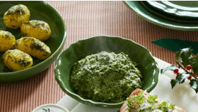 Skræl og skær kartoflerne i skiver, de skal være sammenhængende i bunden. Blend olie, persille, citron, salt og peber og hæld det i en skål. Vend kartoflerne i den grønne blanding og sæt dem i et ovnfast fad. Sæt dem i ovnen på midterrillen ved 200° ¾-1 time, til de er møre.