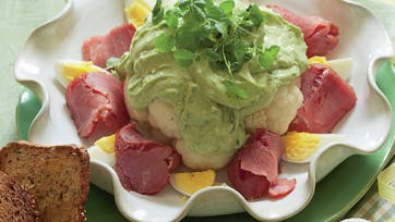 Skræl avocadoen, fjern stenen og miks kødet med en blender. Rør avocadokødet med skyr og fløde. Smag til med salt, peber, citronsaft og paprika. Hak brøndkarsen (gem lidt til pynt) og rør den i cremen. Læg den afdryppede blomkål på et fad og øs cremen over. Læg æg og mørbrad langs kanten og pynt med brøndkarse.